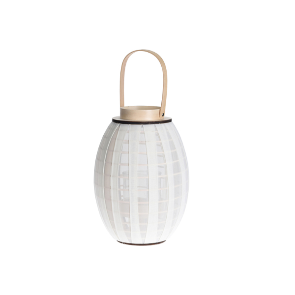 Lyktans kropp är omgiven av ett vitt gasvävt tyg, och inuti lyktan finns en glascylinder i vilket ett ljus ska placeras för att skapa ett mysigt ljus och en härlig atmosfär. Gauze har även ett handtag som gör den enkel att flytta på.