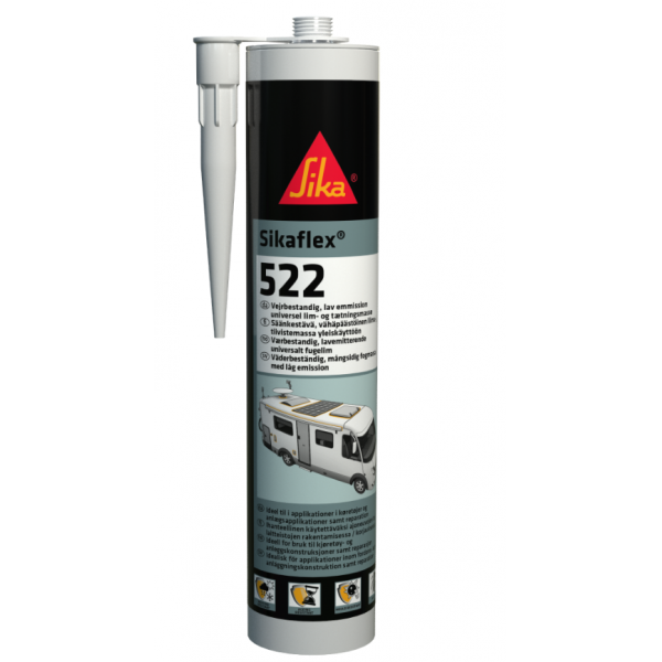 Sikaflex®-522 fäster bra på en mängd olika underlag och är lämplig för interiör och exteriör elastisk tätning och limning. Den är lämplig för applikationer i områden med luftventilation och tillfällig kontakt med livsmedel. Lämpliga material inkluderar trä, glas, metaller, grundfärger och lacker (2-komponentsystem), keramiska material och plaster. Sök råd från tillverkaren och utför tester på originalsubstrat innan du använder Sikaflex®-522 på material som är känsliga för spänningssprickor. Denna produkt är endast lämplig för erfarna professionella användare. Tester med faktiska underlag och förhållanden måste utföras för att säkerställa vidhäftning och materialkompatibilitet.