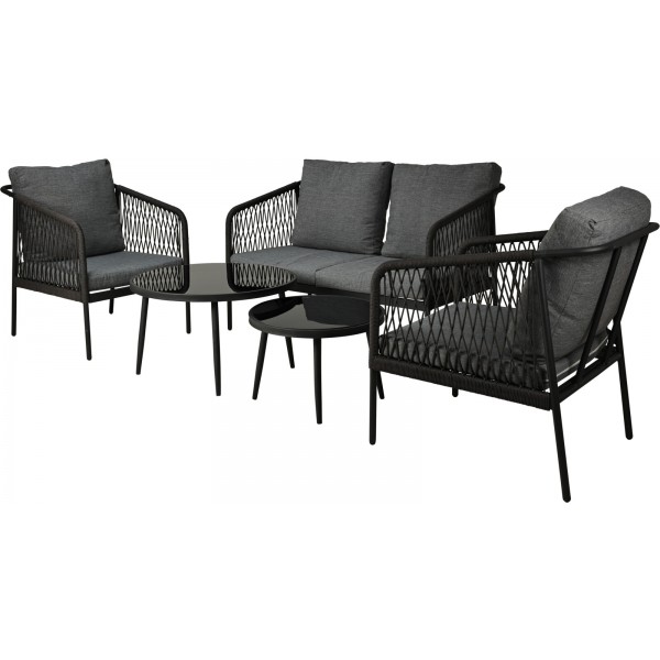 Detta eleganta trädgårdssetet är det perfekta valet för alla trädgårdar eller uteplatser. Setet består av en soffa, två stolar och två bord, vilket ger gott om plats för bekväm sittning och avkoppling. Både fåtöljerna och soffan är utrustade med bekväma, avtagbara sittdynor och ryggdynor. Denna trädgårdsmöbel är inte bara praktisk, utan också snygg, med en modern design som passar perfekt in i ditt utomhusutrymme.