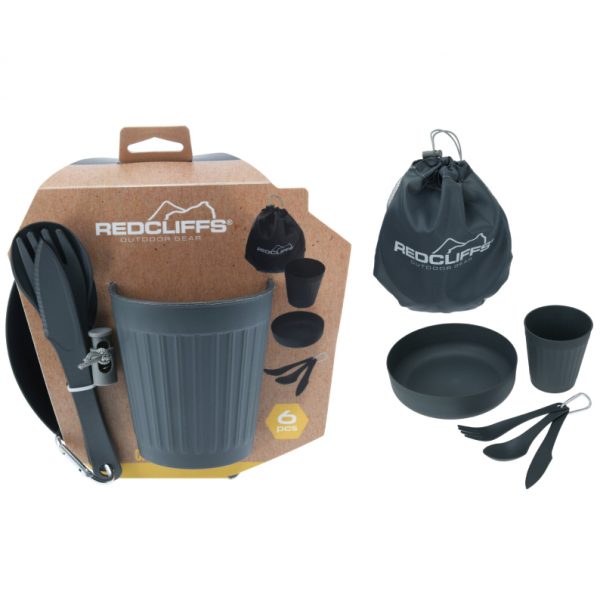 Camping/friluftsset bestående av 6 delar. Kniv, gaffel, sked, mugg, skål samt förvaringsväska.