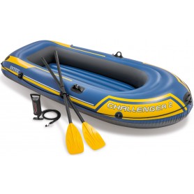 Komplett gummibåt med två sittplatser med dyna, åror och pump.