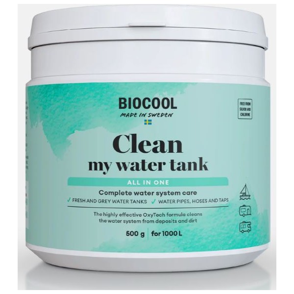 500ml pulver räcker rengöring av 1000liter vattentank. Rekommenderas för dig med vattentank på 100liter och uppåt. Doseringsmått medföljer.